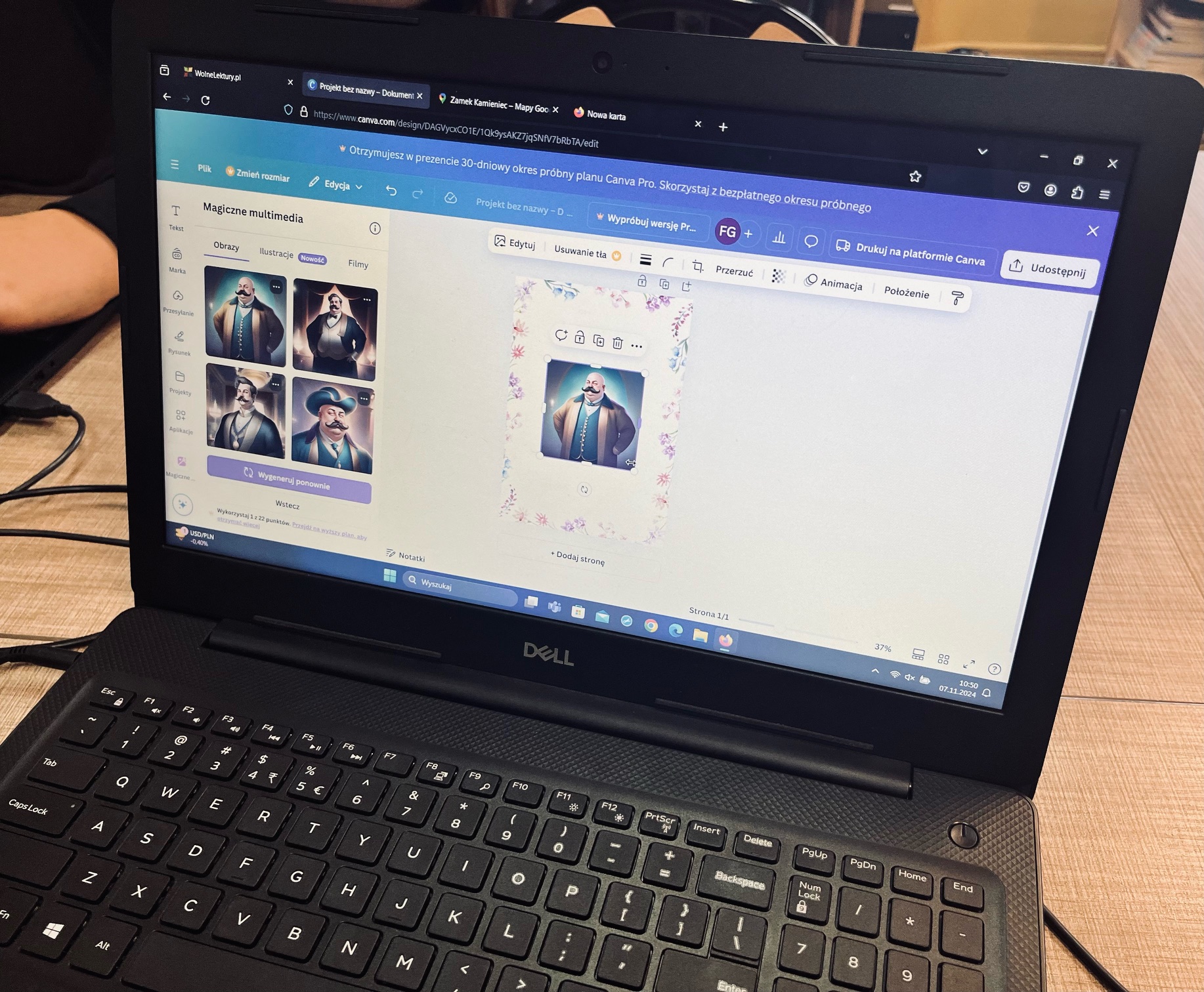 Następnie otworzyliśmy strony wolnelektury.pl oraz canva.com i wzięliśmy się do pracy. Uczniowie poznali podstawowe funkcje programu Canva oraz łatwy sposób na to, by ożywić elementy powieści przy pomocy sztucznej inteligencji, która przemienia tekst w grafikę. Na ekranach pojawiały się realistyczne fotografie miejsc i portrety bohaterów. Omówiliśmy sposoby tworzenia promptów (instrukcji dla AI), które umożliwiają szybkie uzyskanie oczekiwanego efektu. Kiedy mieliśmy już zestaw gotowych grafik, bawiliśmy się dalej w skonstruowanie z nich krótkiego komiksu – obrazkowego streszczenia książki. A gdy już mieliśmy gotowy komiks – trzeba było stworzyć dla niego odpowiednią okładkę! Efekty działań moich słuchaczy można podziwiać poniżej! ☺️