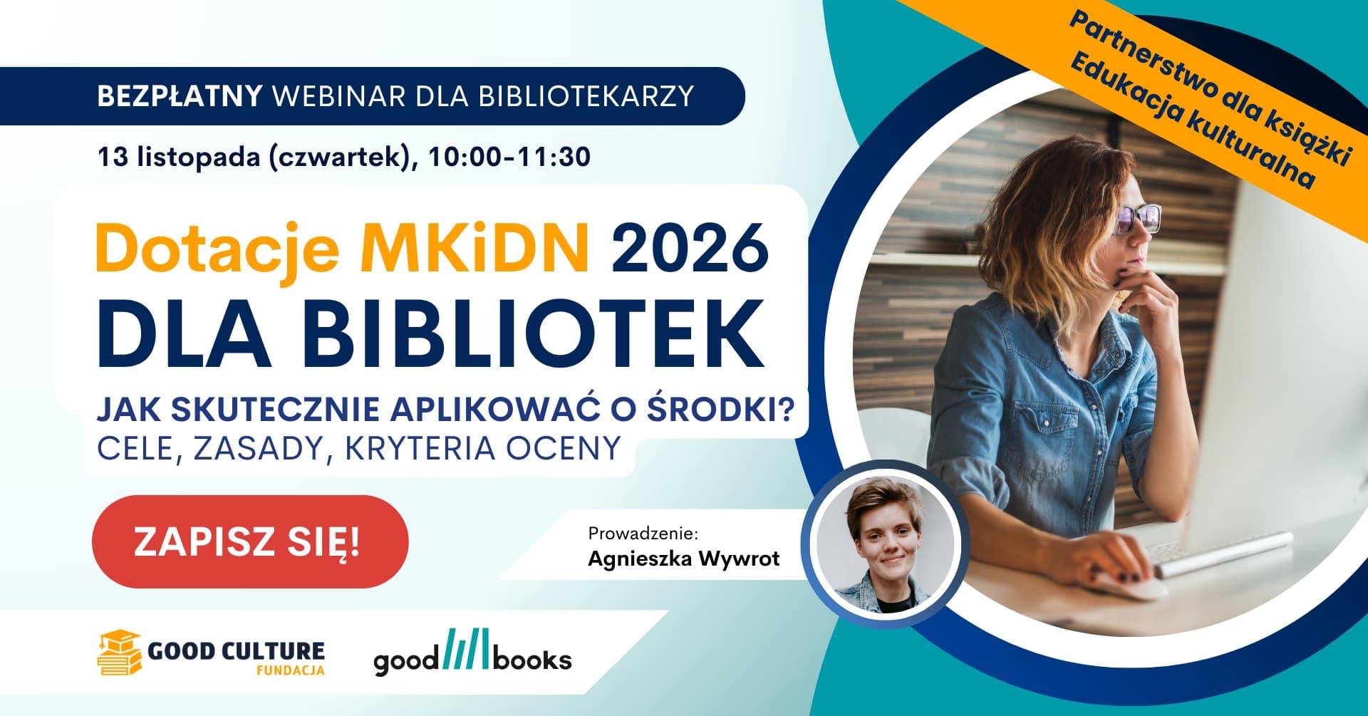 Webinarium ma charakter informacyjny. Fundacja Good Culture i Good Books nie są operatorami rządowych programów dotacyjnych. Oficjalne informacje znajdują się na stronie: https://www.gov.pl/web/kultura/programy-2026.