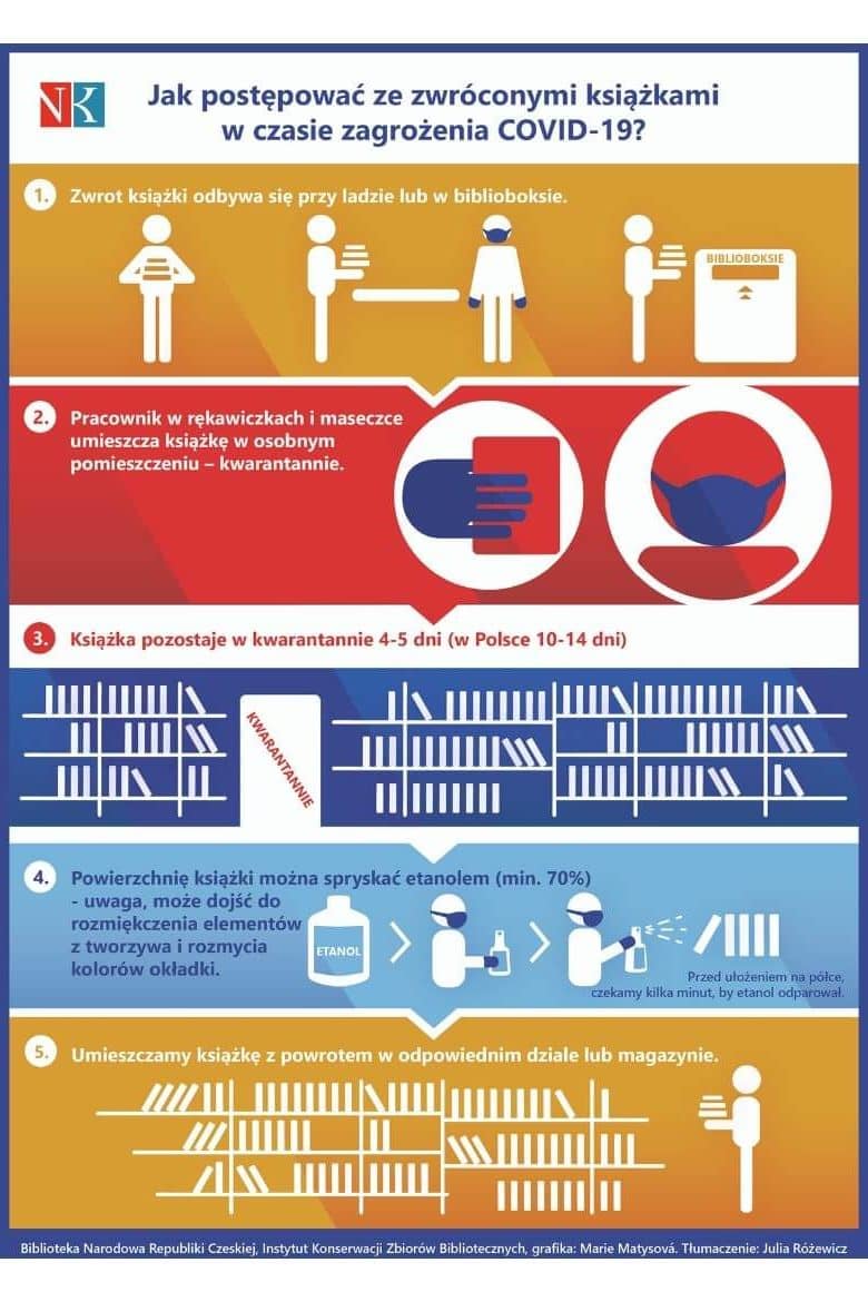 Dzięki uprzejmości naszych czeskich przyjaciół i zaangażowaniu dra Víta Richtera, przedstawiamy Wam, przygotowaną przez Instytut Konserwacji Zbiorów Bibliotecznych Biblioteki Narodowej Republiki Czeskiej, infografikę z instrukcją postępowania z książkami w czasie kwarantanny.