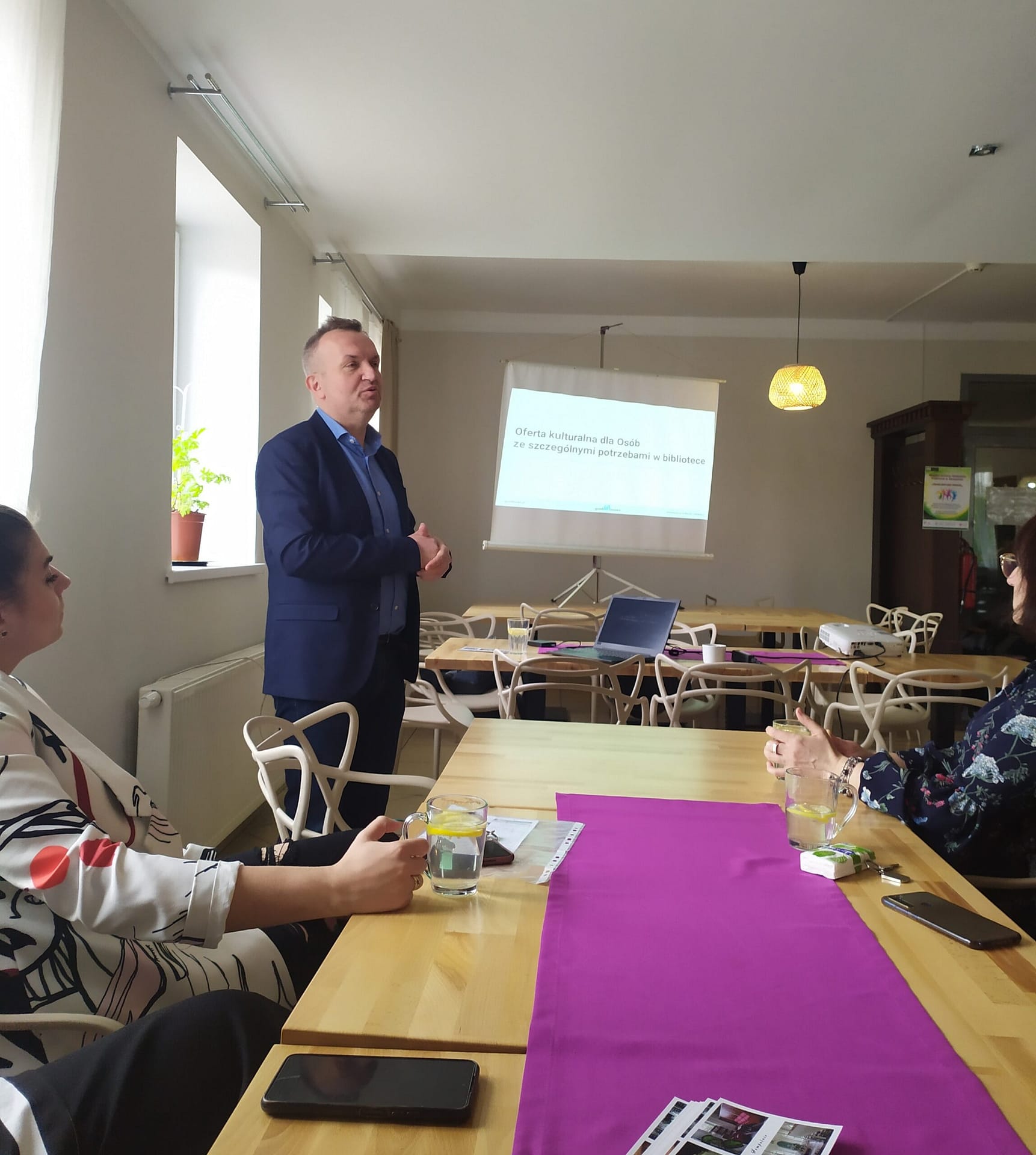 „Oferta kulturalna dla osób ze szczególnymi potrzebami w bibliotece” to temat szkolenia, które odbyło się 5 maja 2022 roku. W spotkaniu w OW ALFA w Rewalu udział wzięła kadra zatrudniona w jednostkach sektora publicznego z miejscowości Sompolno (m. in. z urzędu, ale w przeważającej części z biblioteki publicznej), a także z Konina. Szkolenie poprowadził Paweł Szczyrski, samorządowiec z 25-letnim stażem, specjalista ds. dostępności, pracownik Urzędu Miasta Szczecin, zatrudniony jako koordynator ds. dostępności.