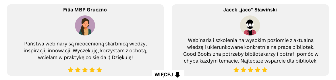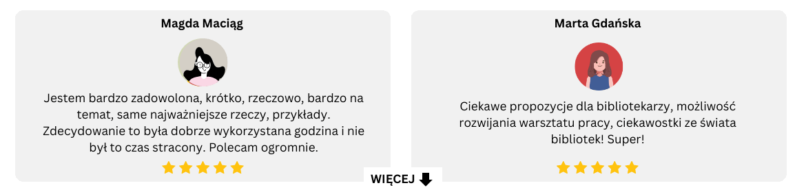 Czyli poszukujemy autorytetu i potwierdzenia. Dlatego opinie są tak ważne! Opinie (w marketingu nazywane „testimonials”), czyli komentarze na Facebooku, opinie w Google i marketing szeptany (to, co nasi odbiorcy opowiadają swoim znajomym). Warto zadbać o każdą opinię. Do biblioteki przyjeżdża znany pisarz? Nagraj jego słowa o tym, jak świetnie czuje się w Twojej bibliotece! Przychodzi nieśmiała uczennica, która jeszcze nie wypożyczała książek? Spraw, aby następnym razem przyszła z dwiema kolejnymi koleżankami.
