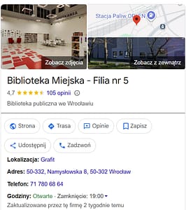 - mapa – wizytówka w Google jest zintegrowana z Mapami, dzięki czemu użytkownik jednym kliknięciem uruchomi nawigację prosto do biblioteki,