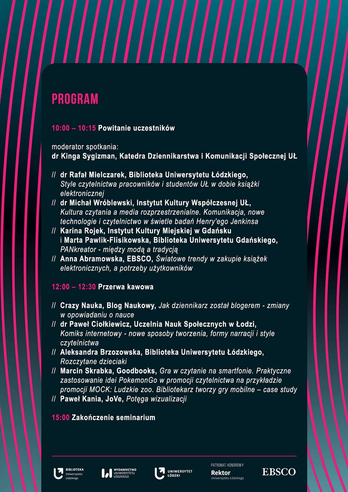 Podczas seminarium zostaną zaprezentowane wykłady o zmieniającym się podejściu do książki w kontekście rozwijających się technologii. Uczestnicy spotkania będą rozmawiać o przeobrażeniach w kulturze czytania, współczesnych ilustracjach, publikacjach elektronicznych, relacjach tekstu i grafiki, komiksie internetowym, blogach naukowych oraz łączeniu literatury z grami.